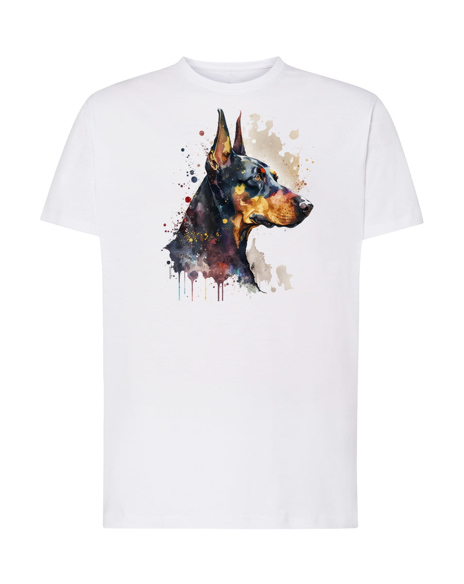 Męska koszulka czarny doberman akwarela. Koszulka oraz nadruk wykonane w najwyższej jakości. Dostępna w 3 klasycznych kolorach: białym, szarym i czarnym. Idealna na prezent.