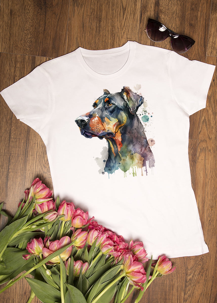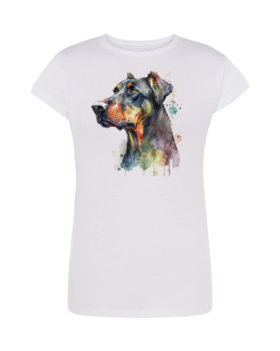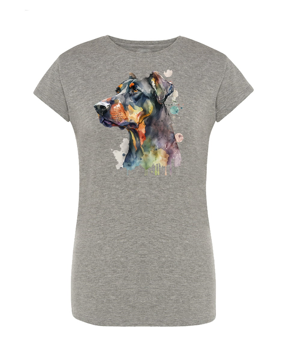 doberman naturalny akwarela . Koszulka oraz nadruk wykonane w najwyższej jakości. Dostępna w 3 klasycznych kolorach: białym, szarym i czarnym. Idealna na prezent. Spraw sobie damską koszulkę z napisem!