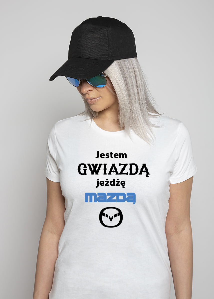 Jestem gwiazdą jeżdżę mazdą. Koszulka oraz nadruk wykonane w najwyższej jakości. Dostępna w 3 klasycznych kolorach: białym, szarym i czarnym. Idealna na prezent. Spraw sobie damską koszulkę z napisem!