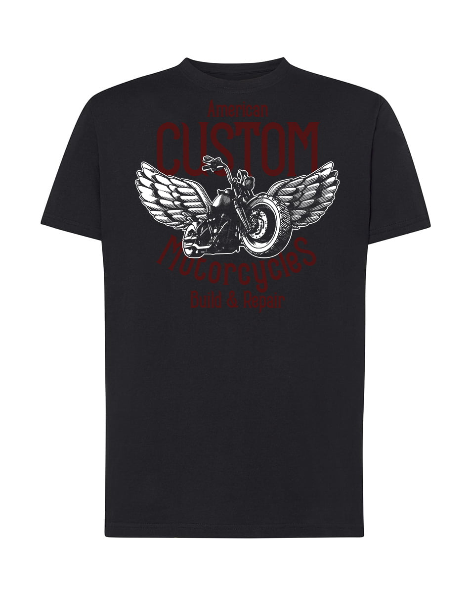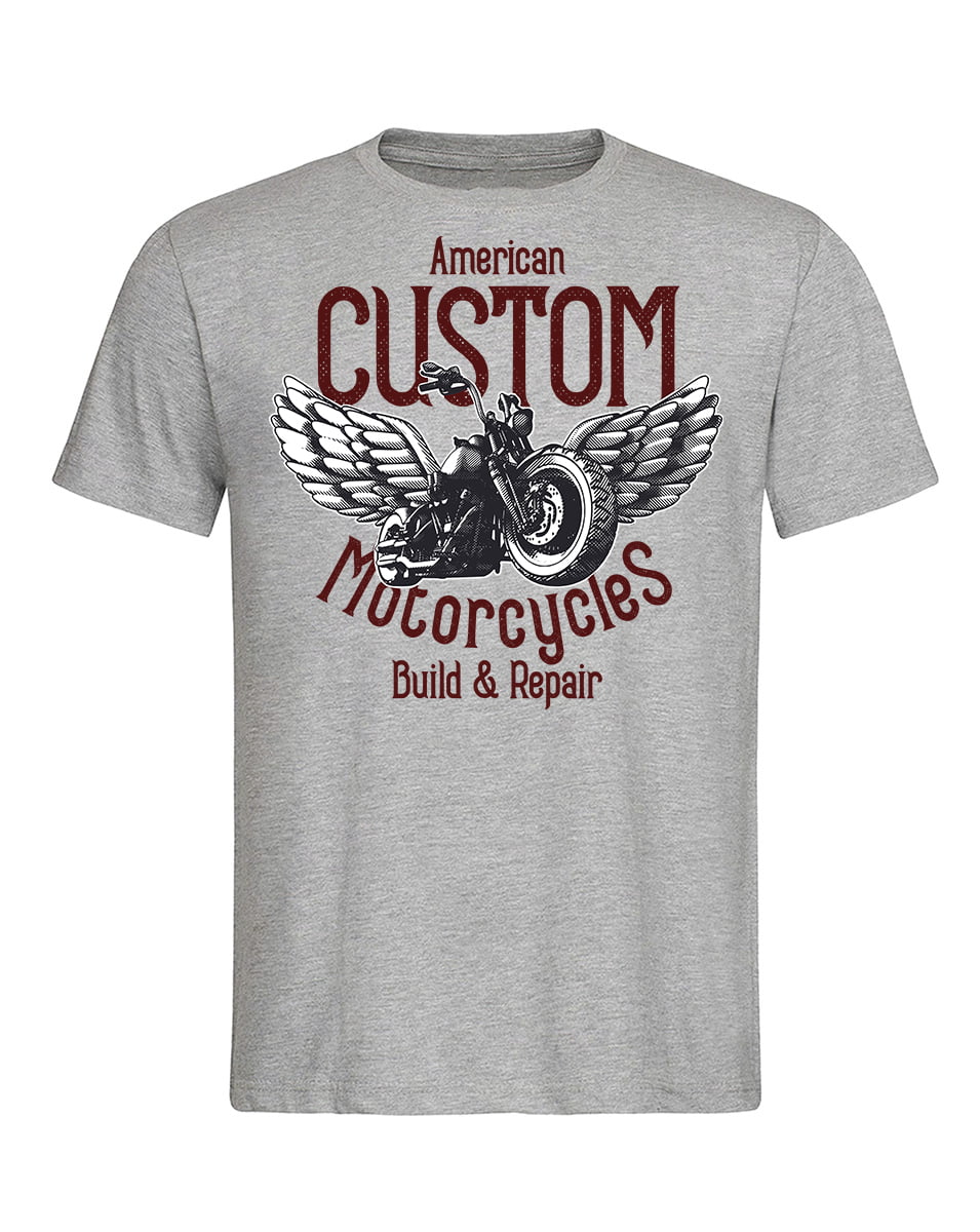 Koszulka American custom motorcycle. Koszulka oraz nadruk wykonane w najwyższej jakości. Dostępna w 3 klasycznych kolorach: białym, szarym i czarnym. Idealna na prezent.