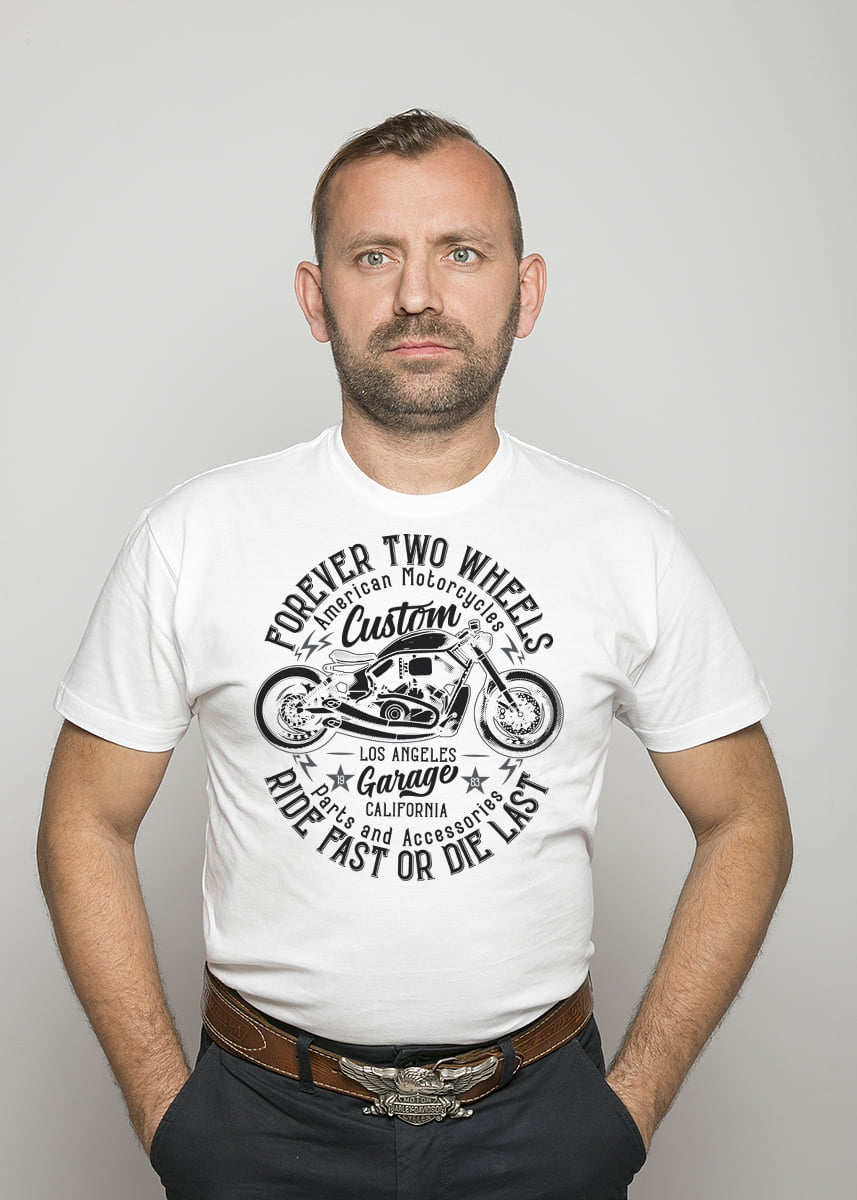 Koszulka Forever two wheels. Koszulka oraz nadruk wykonane w najwyższej jakości. Dostępna w 3 klasycznych kolorach: białym, szarym i czarnym. Idealna na prezent.