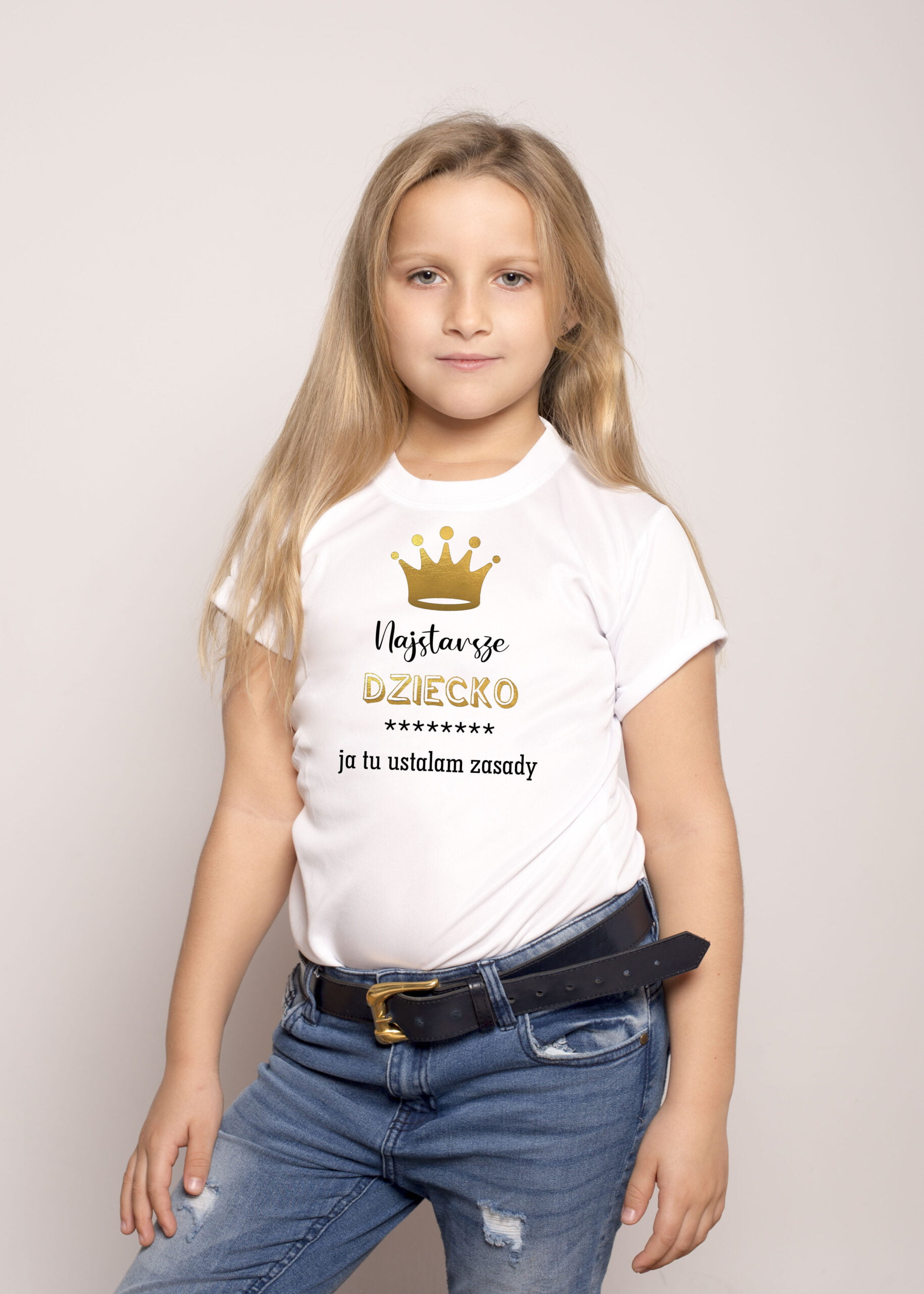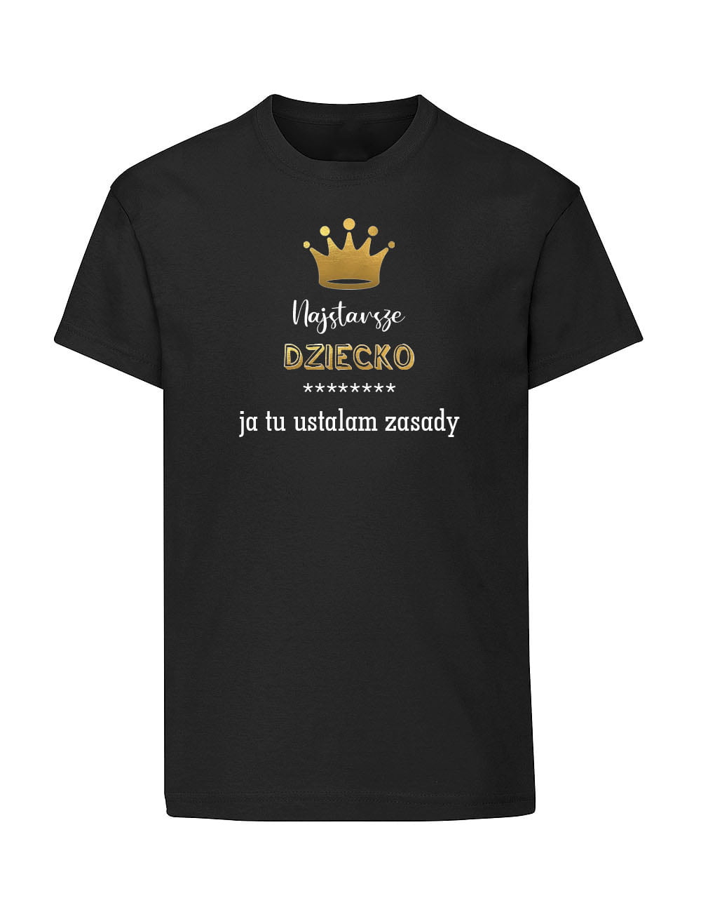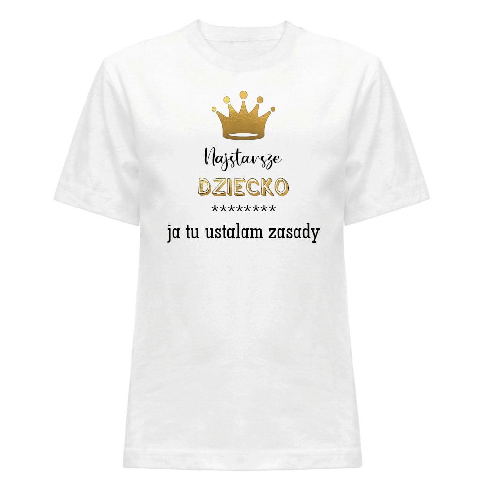 Koszulka najstarsze dziecko. Koszulka oraz nadruk wykonane w najwyższej jakości. Dostępna w 2 klasycznych kolorach: białym i czarnym. Idealna na prezent.