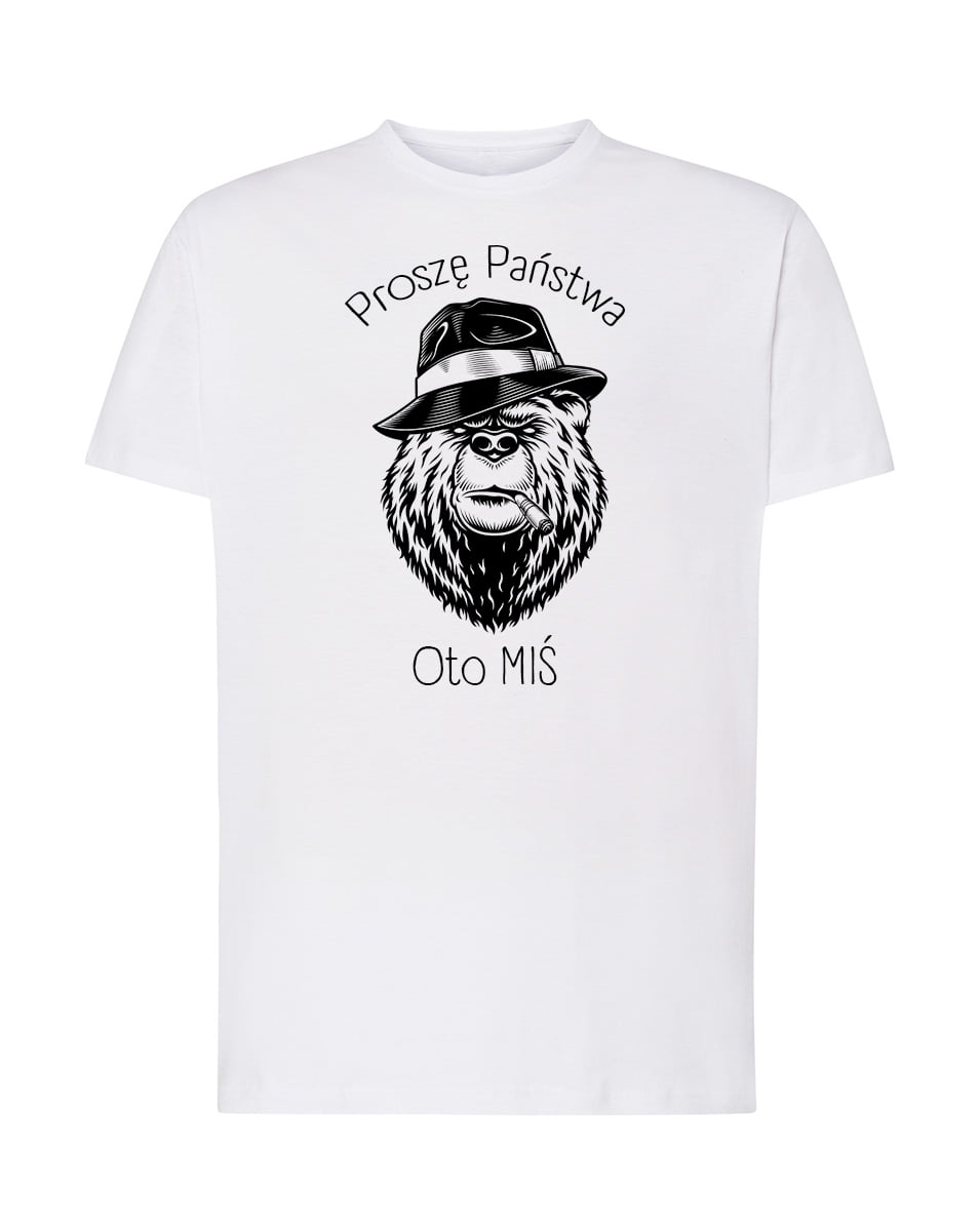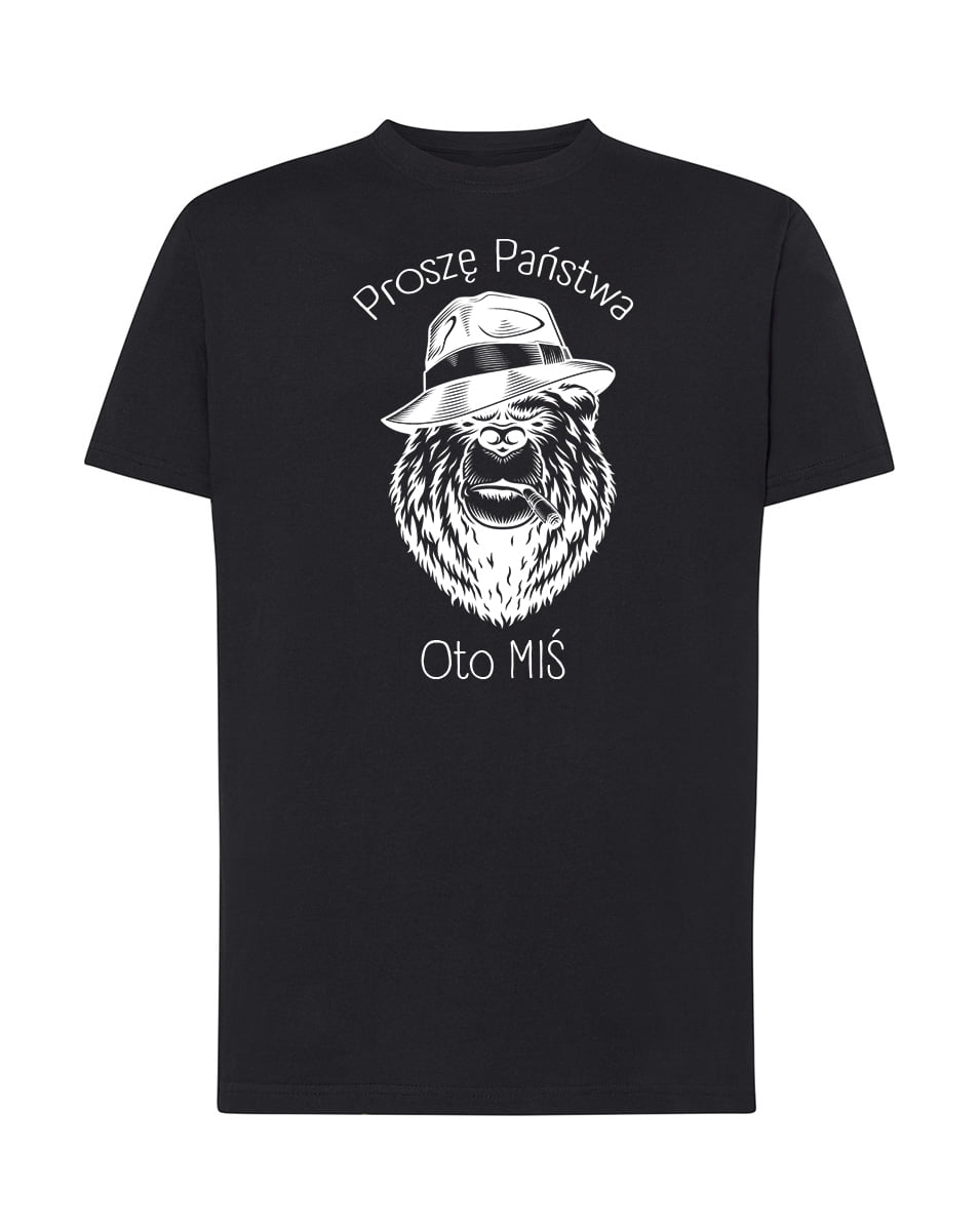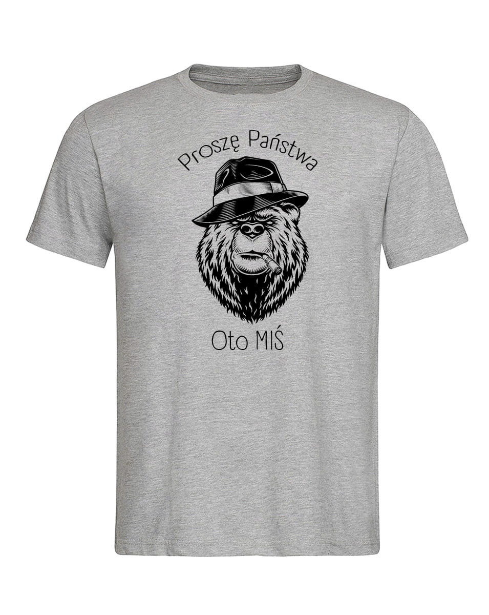 Koszulka Oto miś. Koszulka oraz nadruk wykonane w najwyższej jakości. Dostępna w 3 klasycznych kolorach: białym, szarym i czarnym. Idealna na prezent.