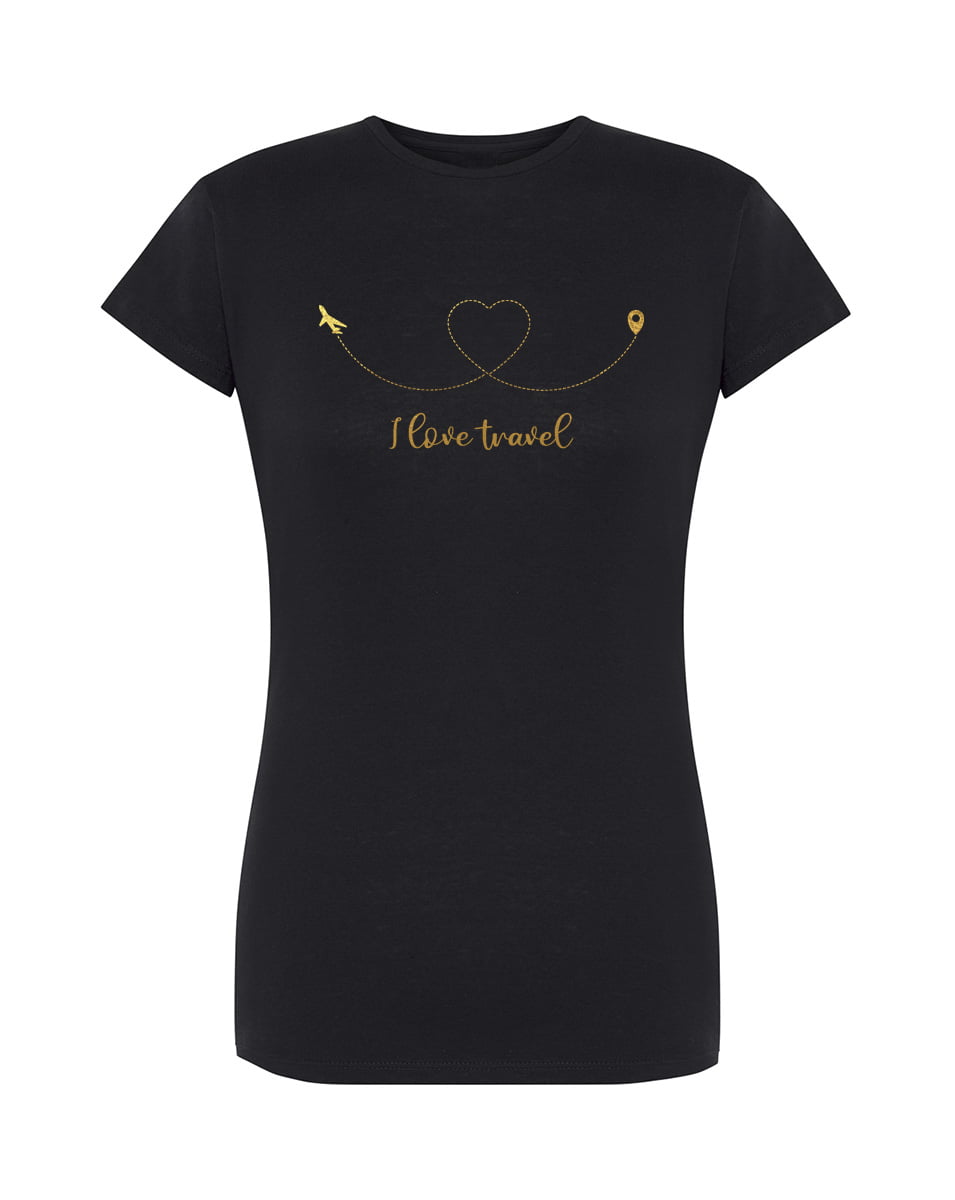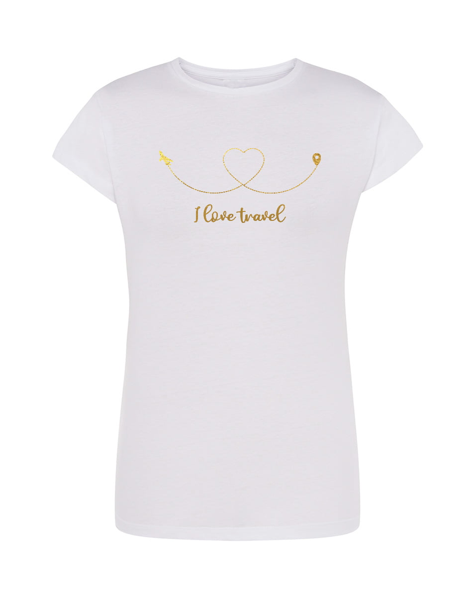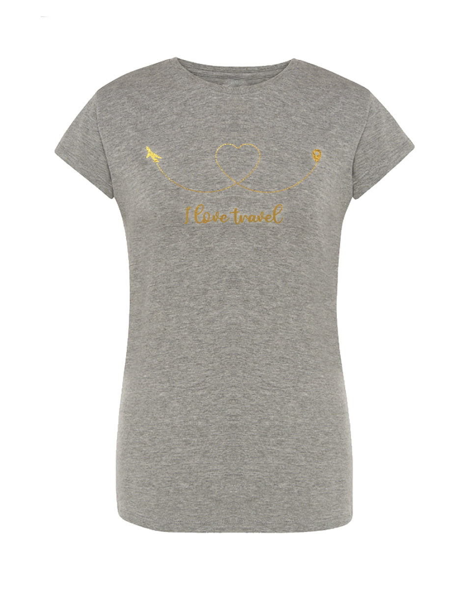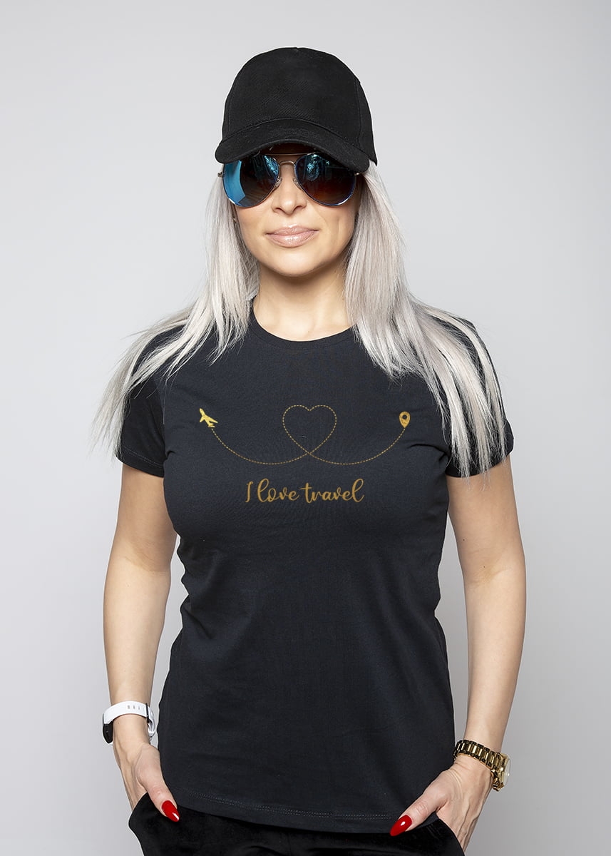 Koszulka podróż. Koszulka damska – ze złotym napisem „I love travel”. Koszulka oraz nadruk wykonane w najwyższej jakości. Dostępna w 3 klasycznych kolorach: białym, szarym i czarnym. Idealna na prezent. Spraw sobie damską koszulkę z napisem!
