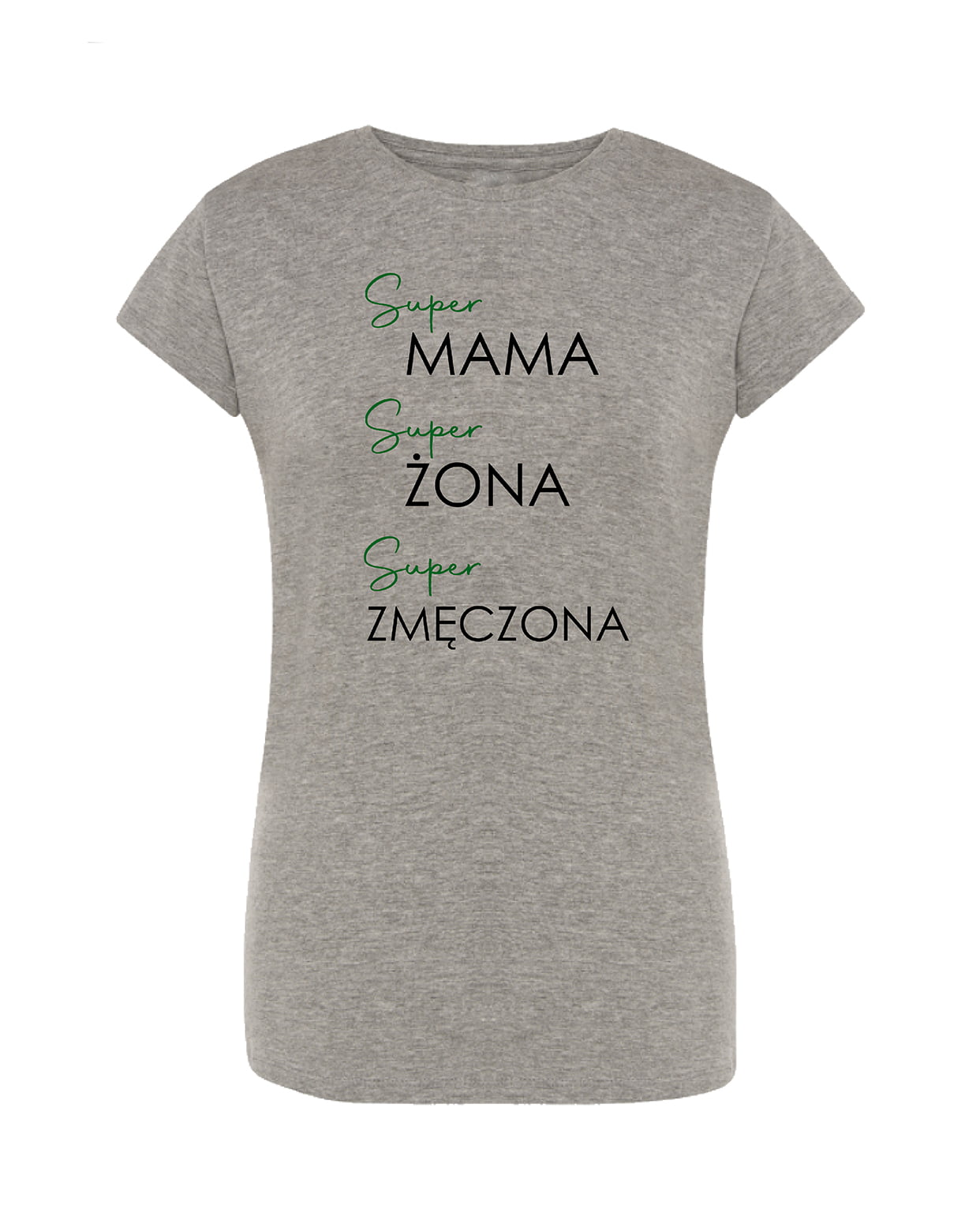Koszulka Super mama, super żona. Koszulka oraz nadruk wykonane w najwyższej jakości. Dostępna w 3 klasycznych kolorach: białym, szarym i czarnym. Idealna na prezent.