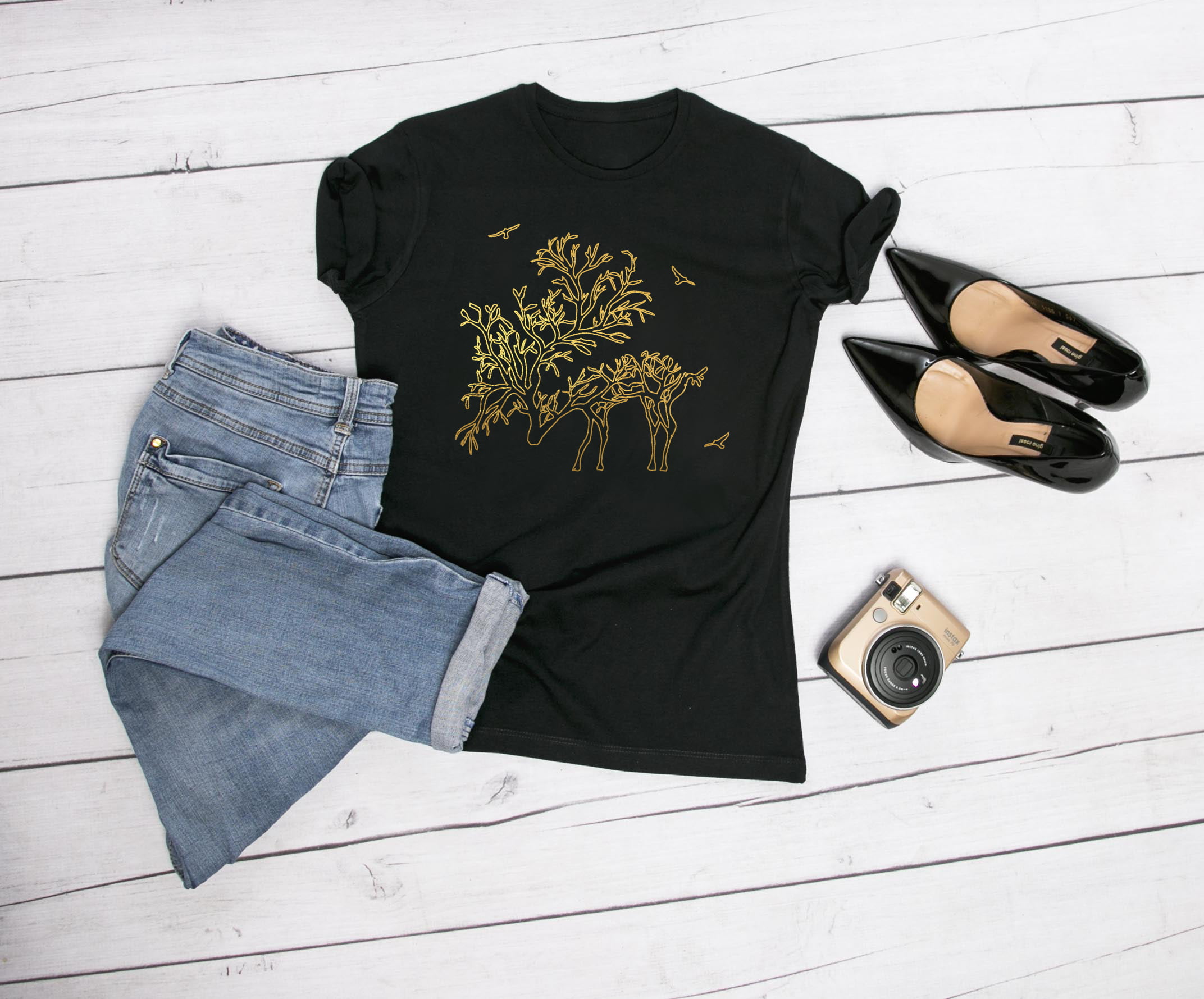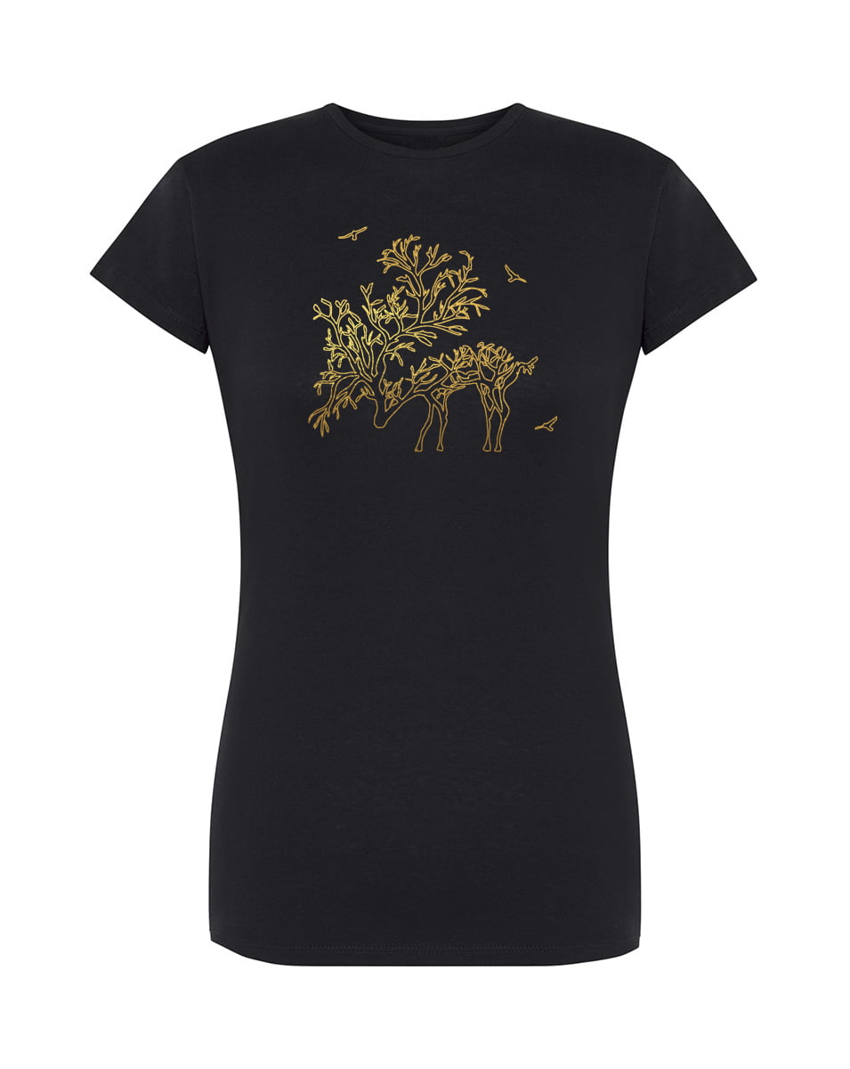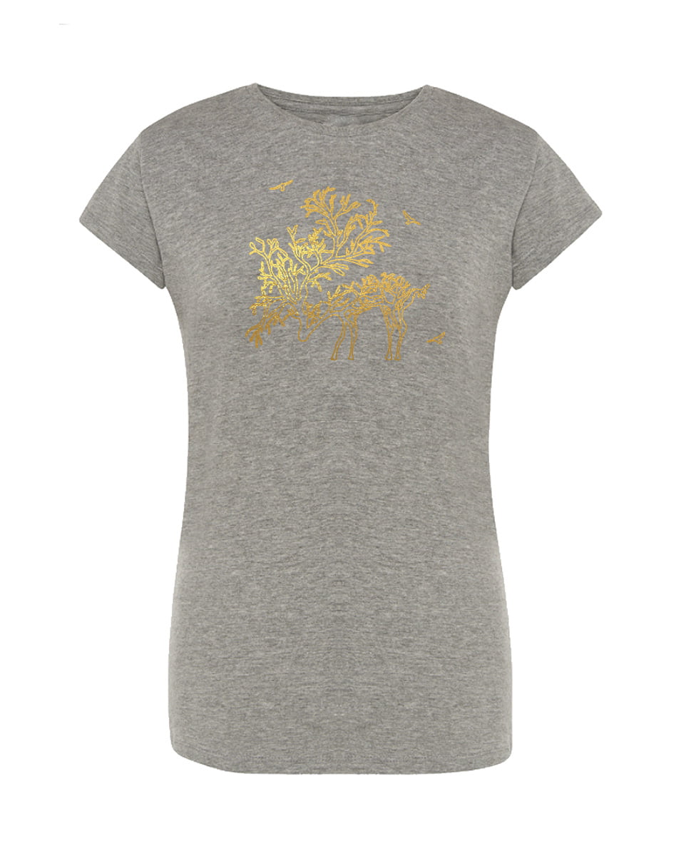 Koszulka złoty jeleń. Koszulka oraz nadruk wykonane w najwyższej jakości. Dostępna w 3 klasycznych kolorach: białym, szarym i czarnym. Idealna na prezent. Spraw sobie damską koszulkę z napisem!