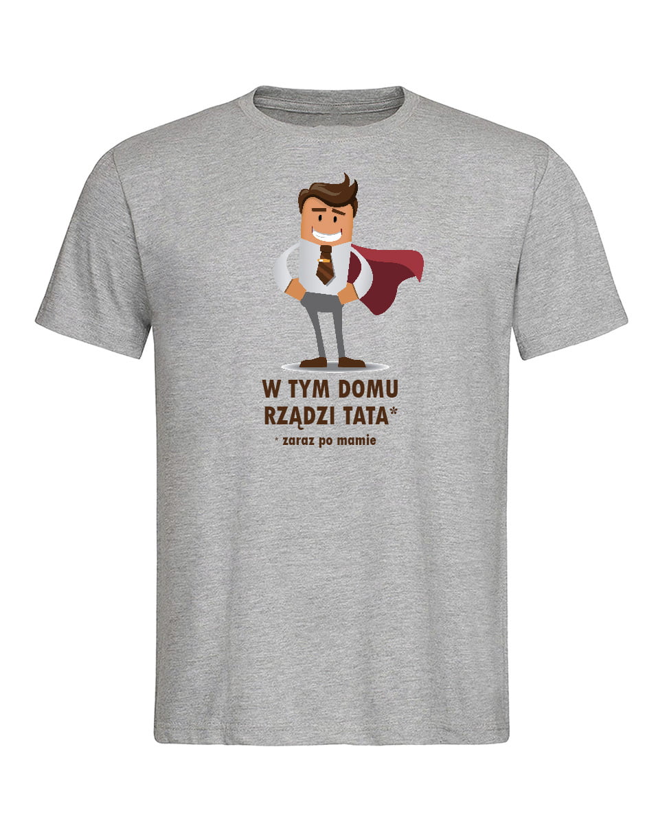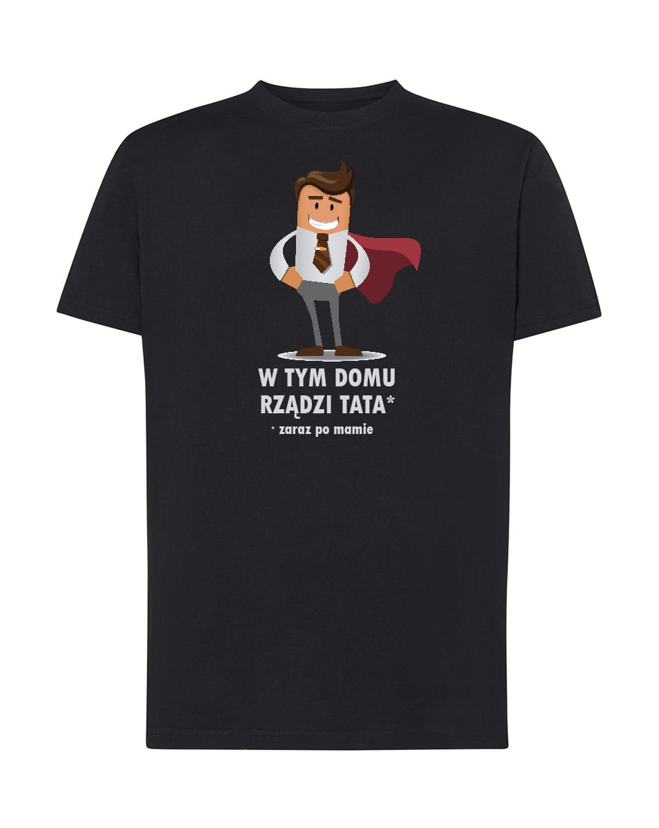 Koszulka w tym domu rządzi tata. Koszulka dla taty z zabawnym nadrukiem. Koszulka oraz nadruk wykonane w najwyższej jakości. Dostępna w 3 klasycznych kolorach: białym, szarym i czarnym. Idealna na prezent.
